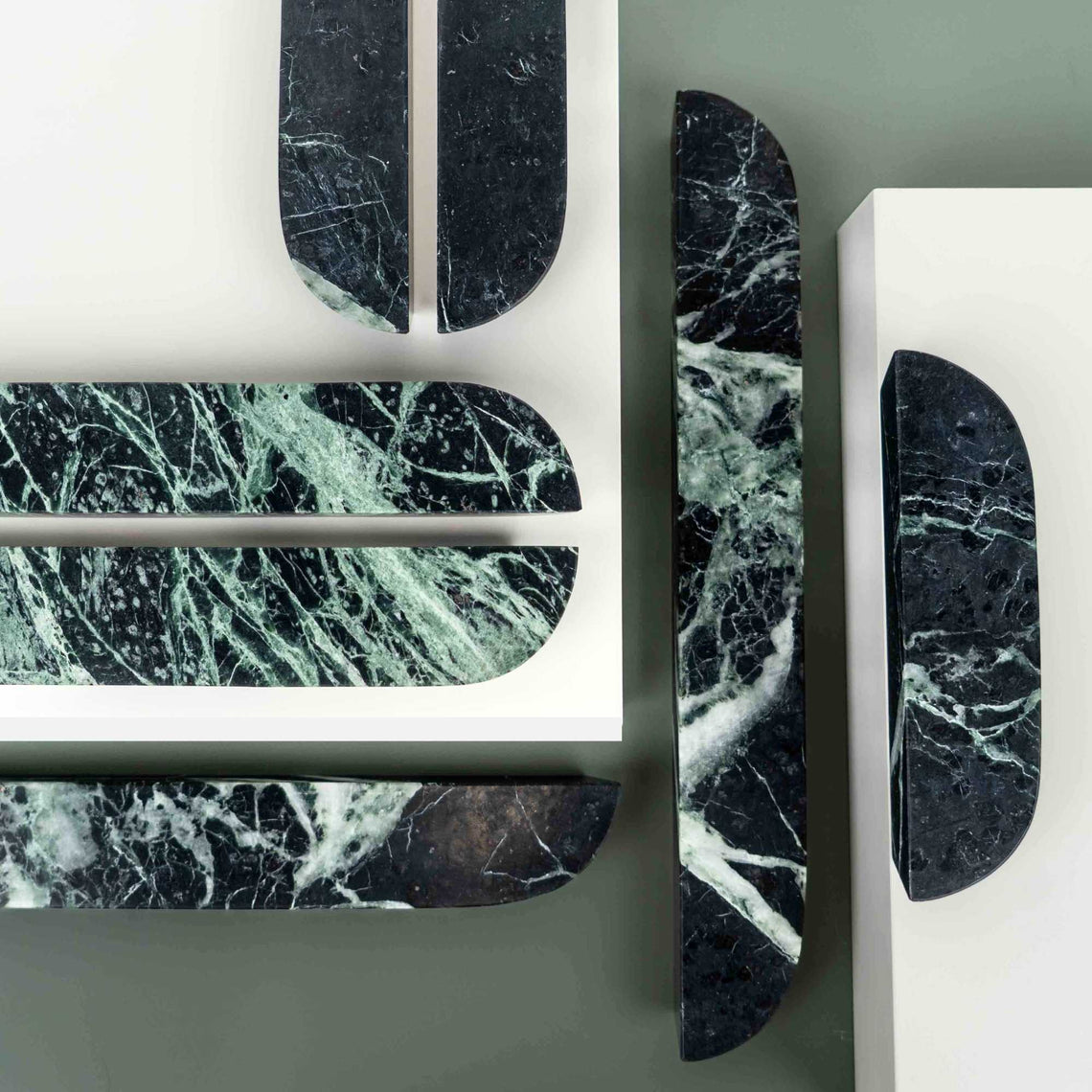 Give your cabinets or furniture a distinctive character with this handle crafted from exclusive Green Flower marble—a natural stone renowned for its vibrant green and white veining. Each pair of handles is unique, with patterns and color variations that only genuine stone can provide. The handle pairs are carved from a single piece of stone so the veining aligns perfectly. They feature a finely polished surface with a honed finish.