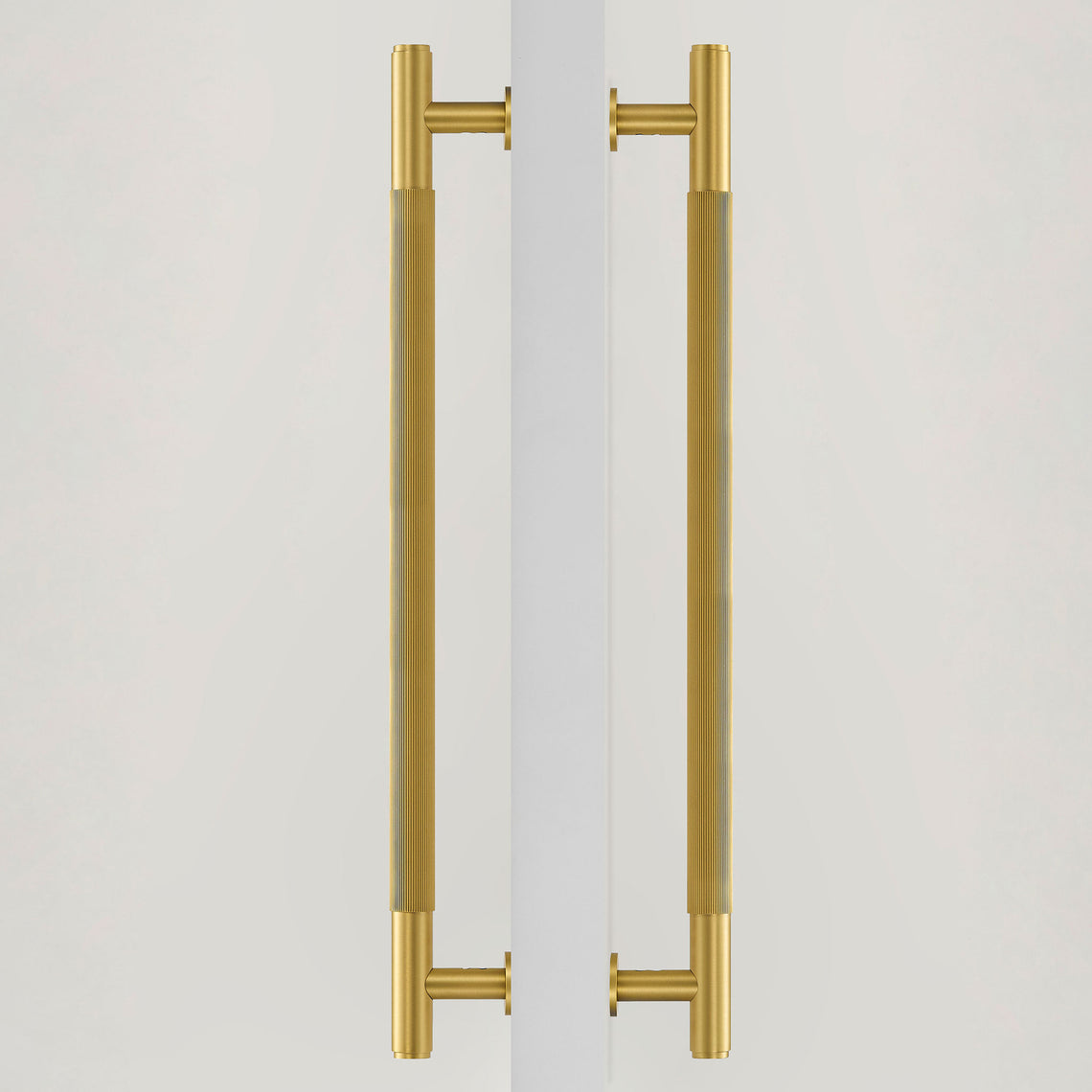 Pull bar en laiton massif avec surface cannélée. Une poignée moderne et robuste, idéale pour une paroi de douche, une armoire ou toute autre installation nécessitant une prise accessible des deux côtés. Son poids imposant, associé aux détails cannélés, ne passe pas inaperçu. Un modèle premium pour ceux qui apprécient le souci du détail et la qualité. Cette pull bar est fabriquée en laiton massif et est livrée en set de 2, avec les fixations incluses pour une installation sur une porte en verre, une porte en bois ou un panneau d’une épaisseur de 35 à 55 mm.