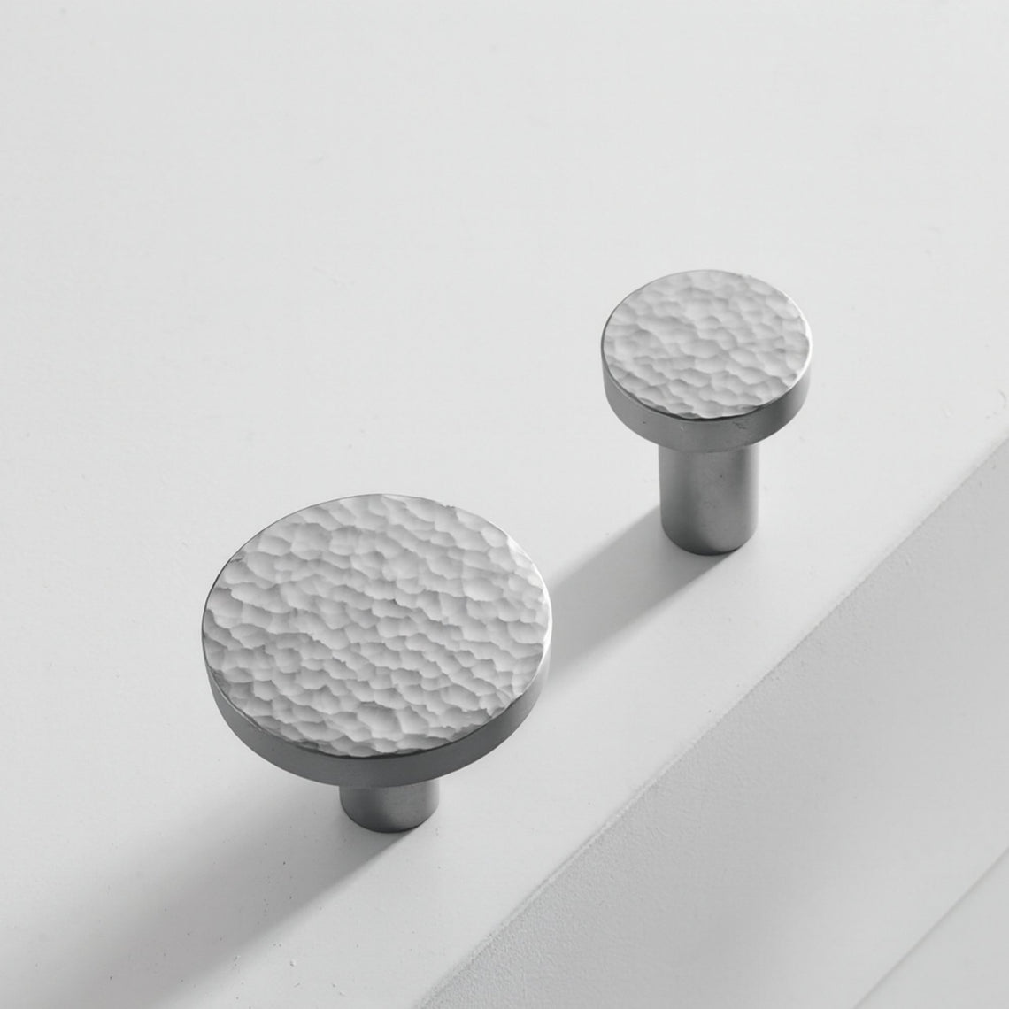 Młotkowana gałka z mosiądzu w eleganckim, matowym wykończeniu chromowym – stylowy detal, który nadaje charakter zarówno meblom, jak i pomieszczeniom. Każda gałka jest ręcznie młotkowana w fabryce, co tworzy unikalny wzór i osobisty akcent w każdym egzemplarzu. Idealna dla tych, którzy szukają ekskluzywnego i autentycznego wyglądu do drzwi kuchennych, komód lub drzwi szafek. Nadaj swojemu domowi unikalny charakter dzięki tym indywidualnie wzorzystym gałkom.