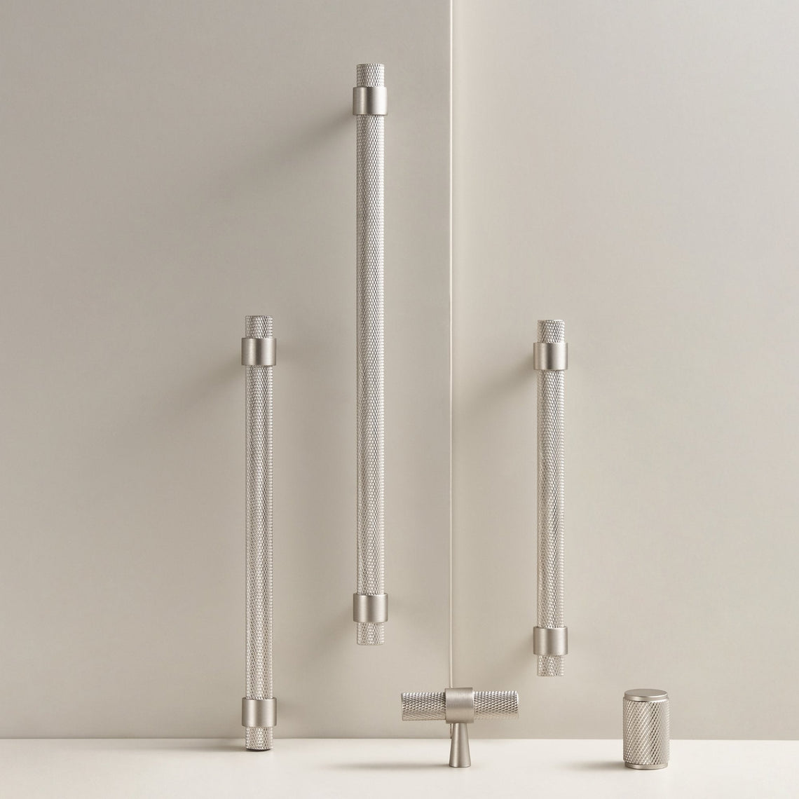 Ekskluzywny uchwyt niklowany z radełkowaną powierzchnią chwytu – stylowy wybór do frontów kuchennych, mebli łazienkowych oraz innych mebli. Solidna mosiężna konstrukcja nadaje luksusową wagę, a radełkowanie dodaje zarówno charakteru, jak i funkcjonalności.